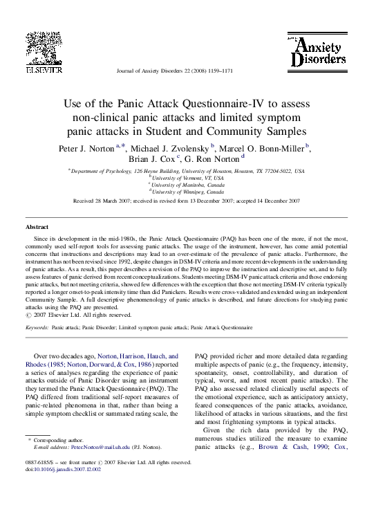 Pdf Use Of The Panic Attack Questionnaire Iv To Assess Non Clinical Panic Attacks And Limited Symptom Panic Attacks In Student And Community Samples Ron Norton Academia Edu