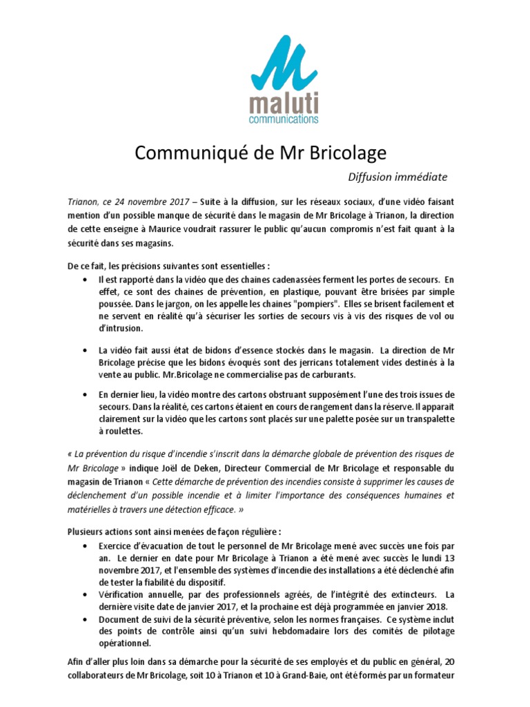 Communique Emis Par La Direction De Mr Bricolage Securite Business