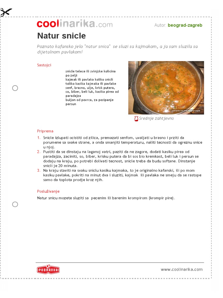 Natur snicle sa senfom. Zatim u tiganj dodajte samleven beli luk i kratko propržite. Korisnica je proglašena cool chef om 21 11 13. Neki dan smo u firmi imali u stvari jednom nedeljno rekla bih natur šnicle sa pirinčem na meniju naravno da čiko kuvar iz kantine nije hteo da mi oda kako ih on priprema pa sam iskombinovala nešto sa više izvora i to nam se izuzetno dopalo. 4 veće šnicle 200 ml belog vina 3 kašike senfa so i biber 250 ml piva 1 čen belog luka 1 kocka za supu priprema.