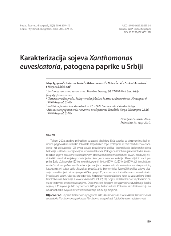 Pdf Characterization Of Xanthomonas Euvesicatoria Strains Pathogens Of Pepper In Serbia Maja V Ignjatov Academia Edu