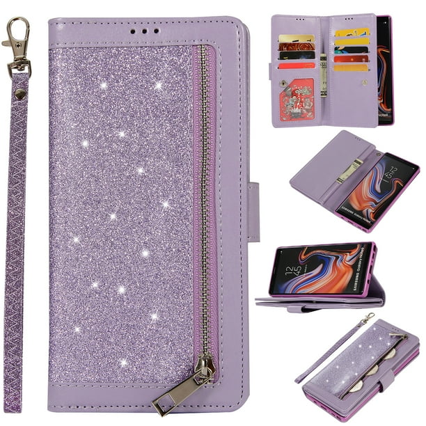 Zipper Wallet Case For Samsung Galaxy Note 9 Phone Allytech Bling Glitter Leather Case With 9 Credit Card Holder Flip Magnetic Closure Stand Cover With Cash Pocket And Hand Strap Purple