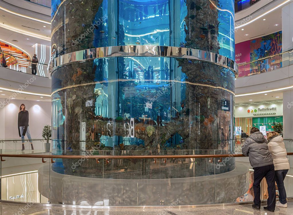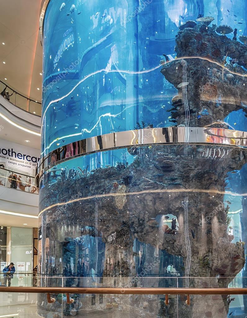 Moscow November 5 2016 Shopping Center Oceania Large Tall Raund Aquarium With The Fishes Plants And Bizarre Underwater Landscape Stock Editorial Photo C Fotiy 129547612