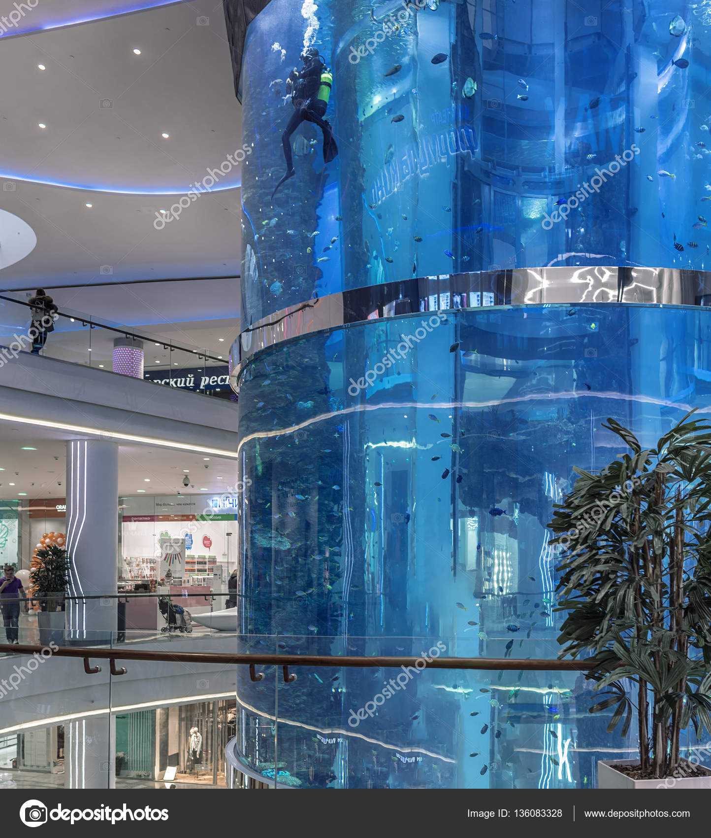 Moscow Shopping Center Oceania Large Cylindrical Aquarium With The Fishes The Diver Cleans The Glass Stock Editorial Photo C Fotiy 136083328