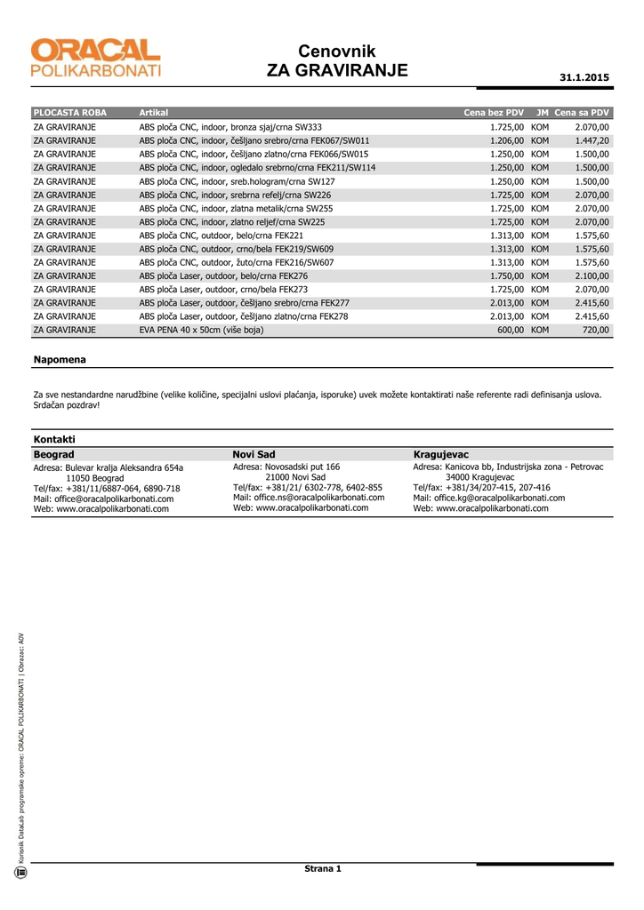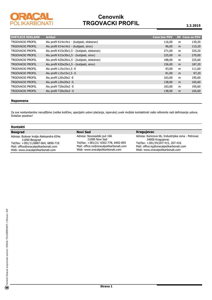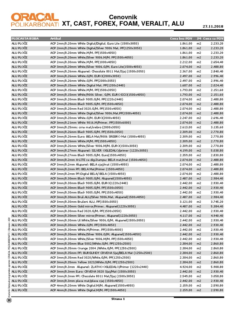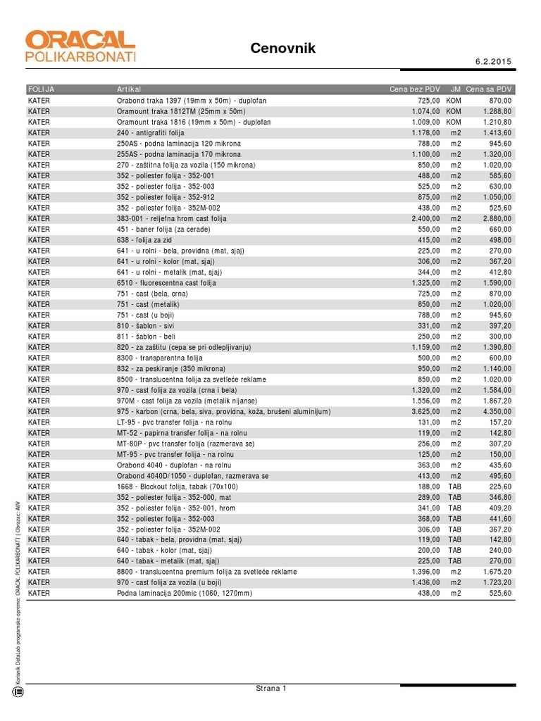 Cenovnik Xt Cev Srb Oracal Polikarbonati