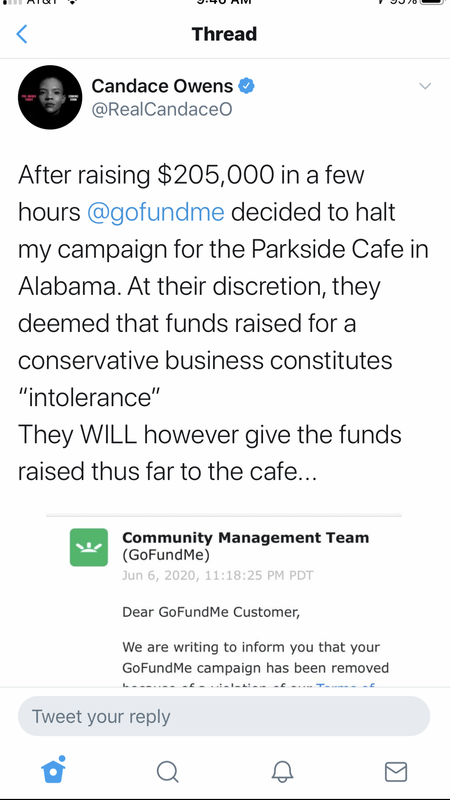 Candace Owens On Twitter After Raising 205 000 In A Few Hours Gofundme Decided To Halt My Campaign For The Parkside Cafe In Alabama At Their Discretion They Deemed That Funds Raised For
