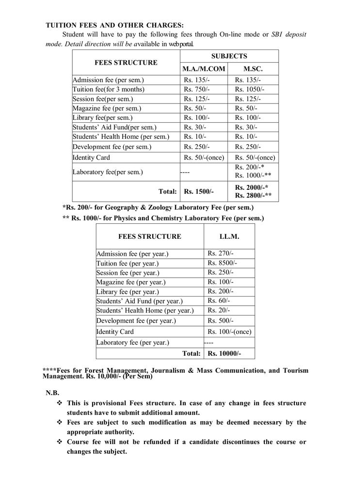 Tuition Fees And Other Charges Student Will Have To Pay