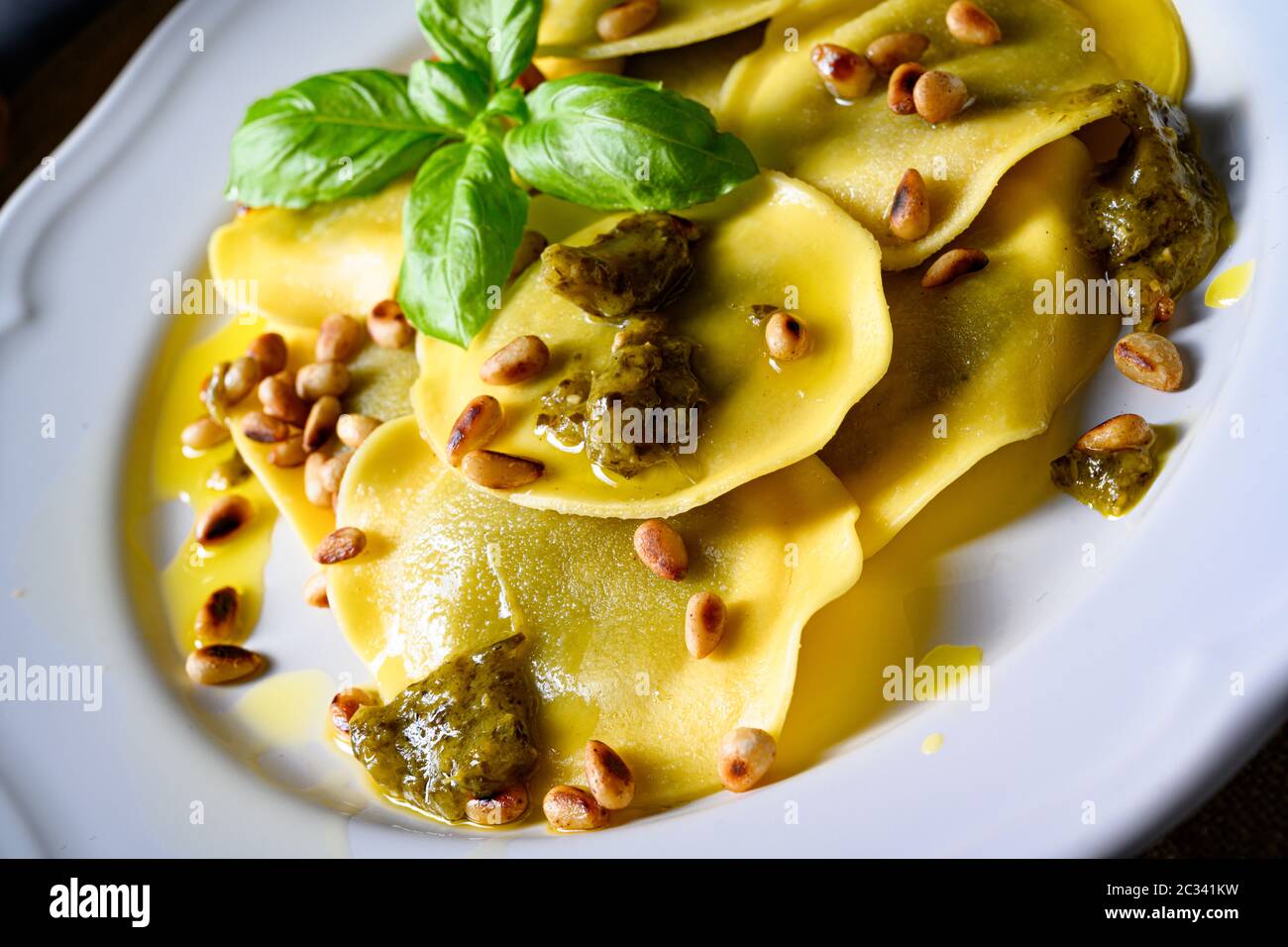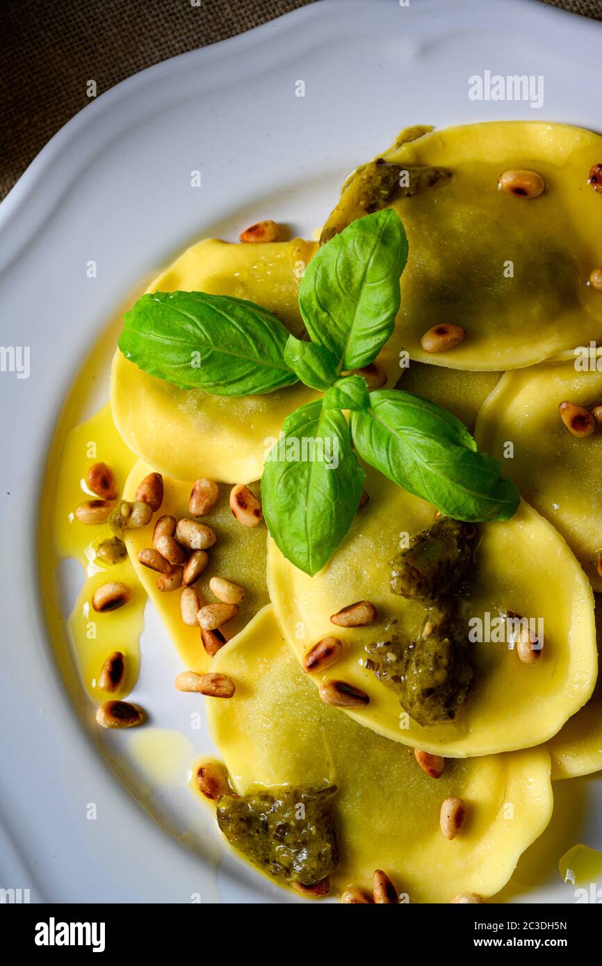 Vegetariano Italiano Tortelli With Roasted Pine Nuts And Pesto Basilico Stock Photo Alamy